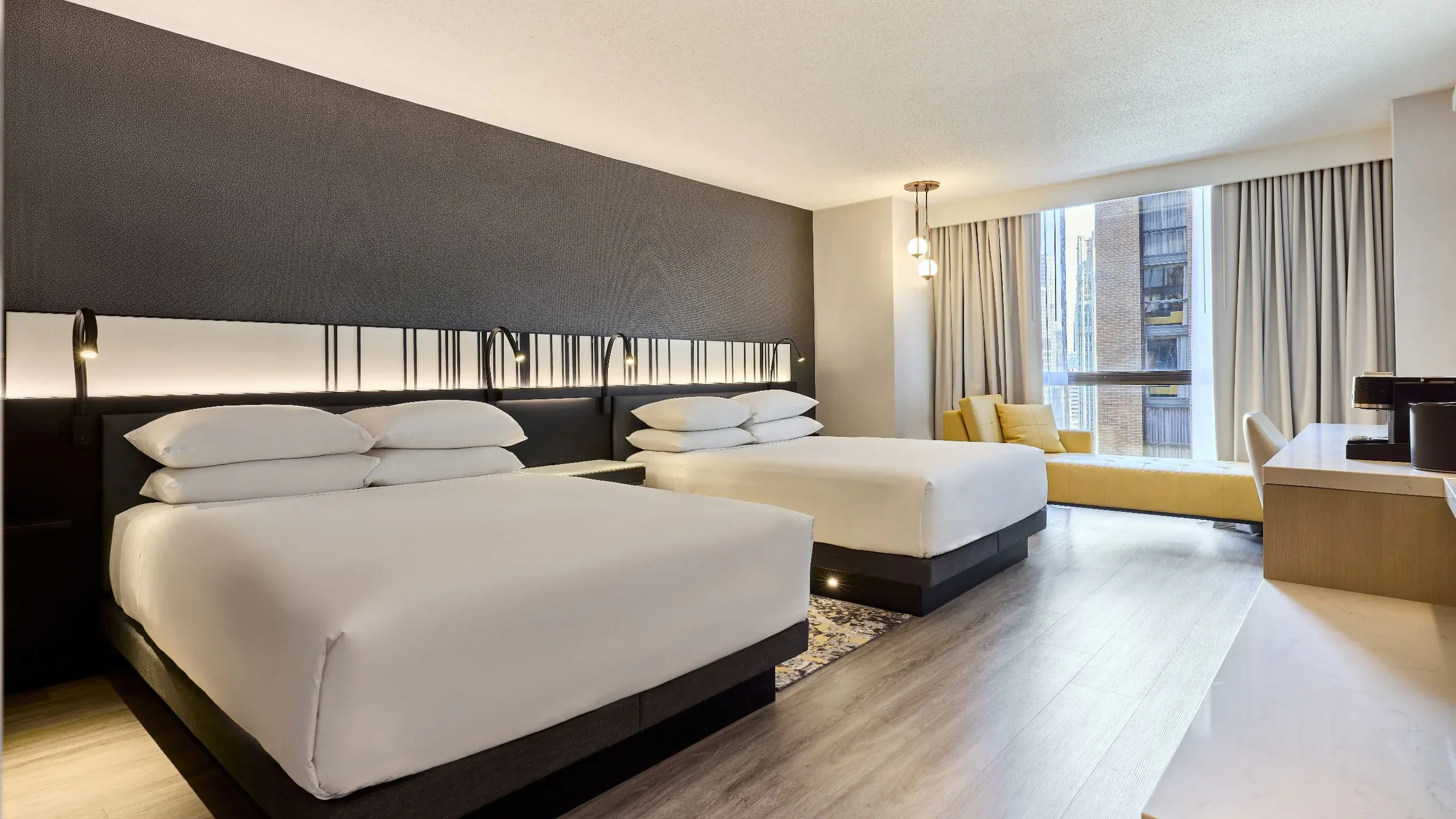 Travailler dans un hôtel‑congrès en activité impliquait une logistique rigoureuse : livraisons par phases, emballage adapté par étage, et coordination étroite avec les opérations de l’établissement. Chaque assemblage a été conçu pour offrir une durabilité exceptionnelle dans un environnement marqué par un taux d’occupation élevé et un roulement constant.