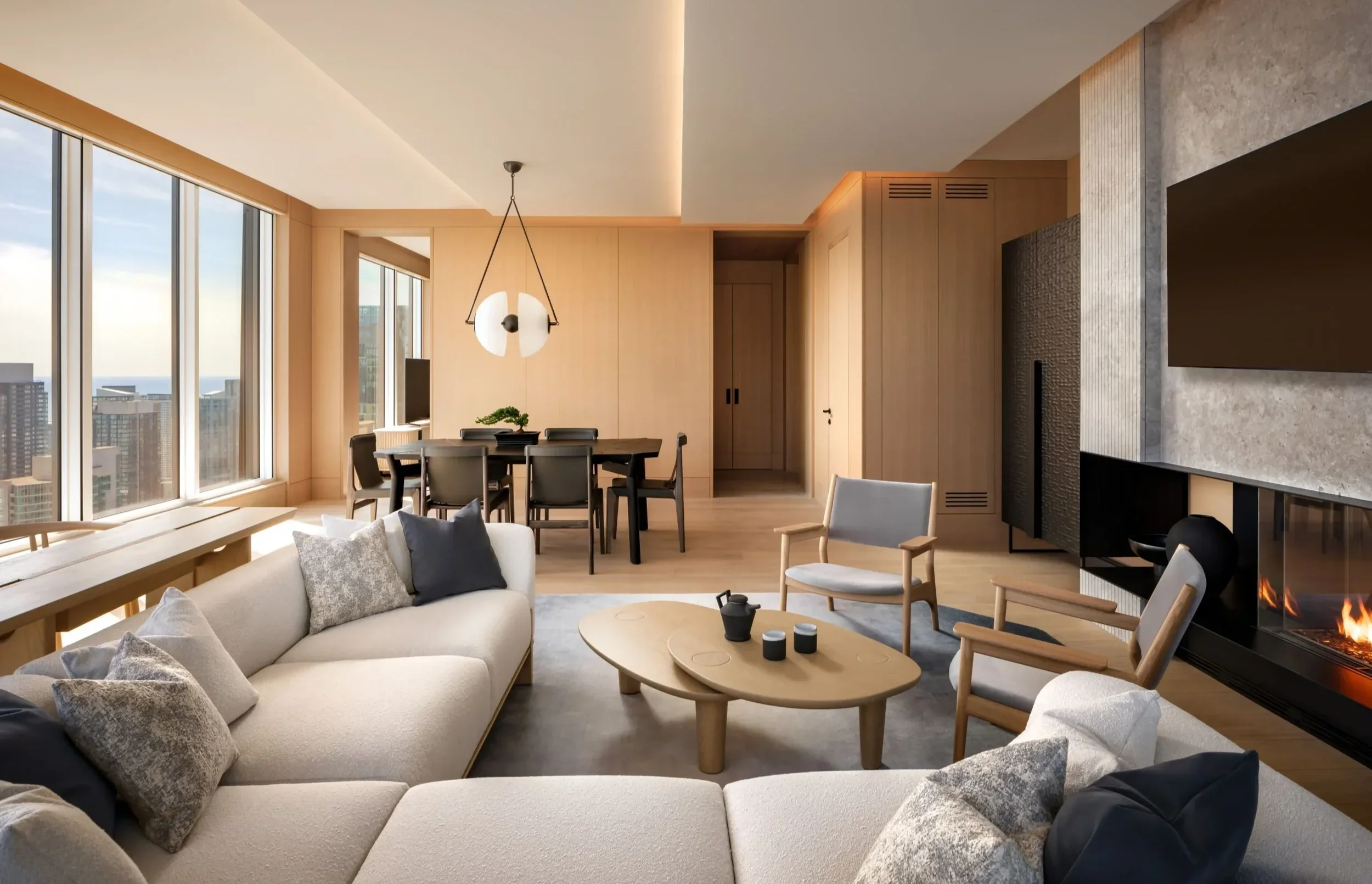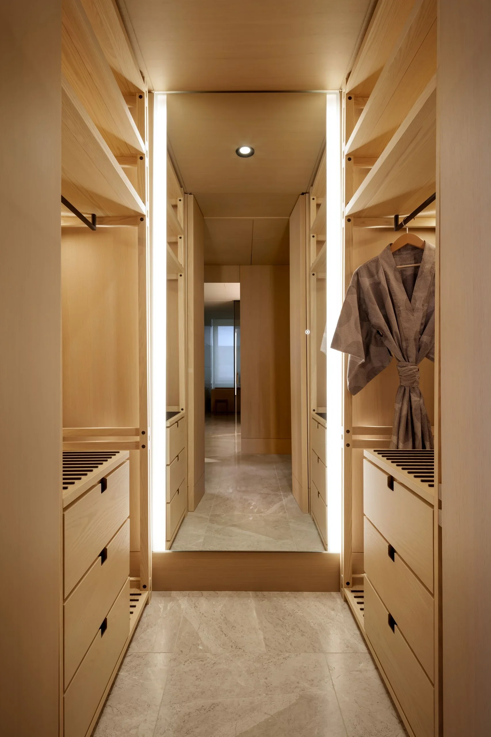 Ce projet exigeait une harmonie parfaite dans l’agencement des placages et une finition d’un niveau artisanal remarquable. Chaque chambre demandait un alignement minutieux du veinage du bois et des détails d’une grande finesse afin de respecter l’esthétique emblématique de Nobu à l’international.